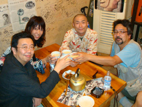 詩人でもあるマスター(右端)や奥様(私の右)たちと店内で記念写真/手前がテーブル席、奥が座敷席になっている