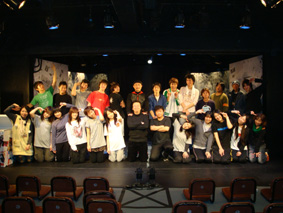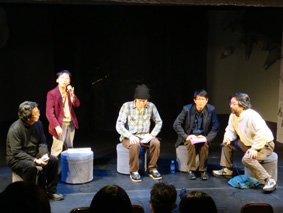 千秋楽公演の前に行われたシンポジウム/左から、私、司会のタイニイアリスの西村さん、大阪の劇団MAYの金哲義氏、パク・クニョン氏、通訳の熊谷さん