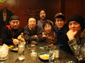 千秋楽の翌日、パク・クニョン氏らと新宿2丁目のburaでお疲れさんの飲み会/シンポジウムの5人に加えて一番左がパーカッションのハンキンさん