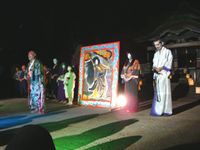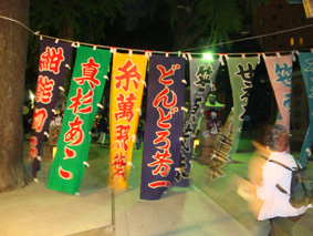 夜行館の公演の舞台である香取神社の本殿の前に、役者たちの名前が書かれた幟があり、ここをくぐって中に入る/アングラな名前と幟はマッチしている