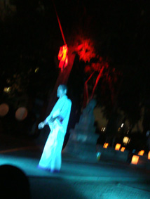 境内の大木の間に張ったロープの上を渡る宙乗りをする赤土類と、白い着物で舞踏を披露する土器空/土器空は土の中から出て来ることもあるしい! アングラはみな身体を張っているのだ!
