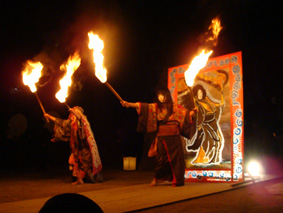 クライマックスで火の点いた松明を持って踊る笹原茂朱(左)と榊芽久美(右)/榊芽久美は表情がいいし、堂々としていて、まさにアングラ劇のヒロインという感じ!