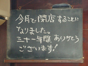 いつもはその日のお薦めメニューが書かれている黒板に、この文章が/こちらこそ、ホントに31年間、ありがとうございます、だ(涙)!