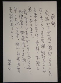 2月に入って私と妻宛に届いた、古里庵のマスターの手書きの閉店通知のハガキ/子供たちの名前も書いてあるのが、泣ける……