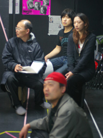 2月の最初の頃に撮った龍昇企画の稽古場写真1/まだ台本を持った半立ち状態の、左から、龍昇、栗原茂、私