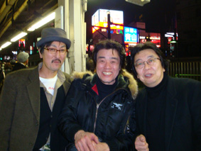 結婚披露パーティーの帰り、新宿駅でいい気分で酔いどれている、左から、渡辺敬彦、新童龍二と私