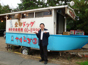 金印ドッグを売っている「やすらぎ丸」は、船をそのまま店にしている/出来上がるまで外で待っていて、出来上がるとマイクで呼ばれる