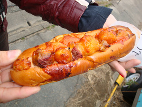 これが出来たての金印ドッグ! サイコロステーキやイカフライが入っていて、ケチャップソースもオリジナルでおいしい!/サイコロステーキが金印に似ているっていうのもあるのかな