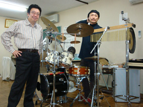 ドラムセットを組んだ稽古場でハンキンさんと/このセットをハンキンさんは福岡から車でタイニイアリスまで運んできた! ありがとうございます!
