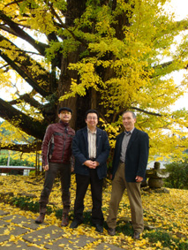 下城の大イチョウの前で薙野さん(右)とハンキンさんと私/とにかく見事なイチョウの木だった