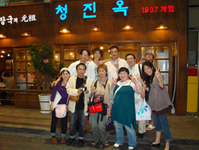 ソウル初日の夜、チョンジノッの前で、渡韓した8人にみんとが加わり、さらに、店から出て来た、日本が大好きだというアジョシ(後ろの左端)も加わって記念写真/24時間営業だから、この近くに泊まったら何時まででも飲んでいられる!