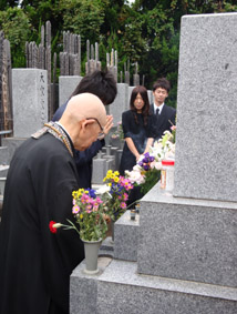 敬老の日の21日に執り行なった父母の十三回忌で墓に手を合わせる三男と見守る妻と次男/久しぶりに聞いた方丈さんの話は、いつもながら心に染みる