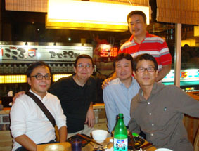 大学路[テハンノ]のクッ・チプにて、左から、青木さん、私、日本の漫画を韓国で出版している、クマさんの友人の李さん、中村さん、パク・クニョン氏/このメンバーと、一ヶ月後にまたソウルで会うことが出来るとは、この時には想像もしなかった