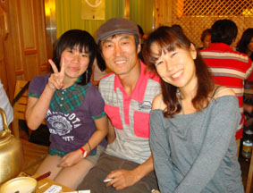 クッ・チプにて、韓国映画によく出ている、クマさんの友人の俳優チョ・トクチェ(乾坤2004年8月第2週の写真館にも載っている)を真ん中に、d'Theaterの山本(左)と橘(右)/トクチェは、ホン・サンスの『浜辺の女』でいい味を出していた