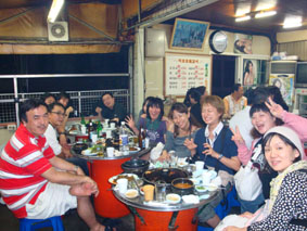 ずっと行きたかった、世和荘旅館近くの、2階にあるビアガーデンのような焼肉屋で、9月の韓国行きメンバーが全員揃い、3時近くまで飲み会/うまい肉を、これでもかというほど食べて飲んで、一人1000円!