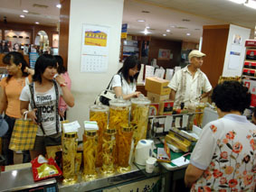クマさんが紹介してくれた南大門市場の高麗人参の店で、おみやげの品を探す石塚やd'Theaterのメンバー/高麗人参といっても、当然ピンからキリまでいろいろある