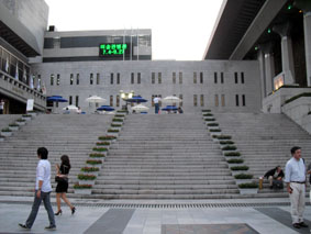 みんなで待ち合わせた世宗文化会館前の大階段/『シュリ』でハン・ソッキュたちがミュージカルを観に行くのに待ち合わせた場所がここ。私は上に登って『ロッキー』も思い出した!