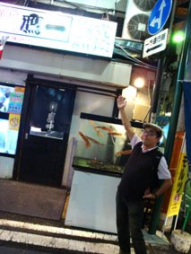 よく見えないが、鷹一の「クマなべ」と書いてある看板を指差している青木さん/今回はクマではなく、店の前の水槽で泳いでいるイカを食べた!
