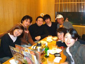 誕生日前夜、d'Theaterの稽古の後、水道橋の「天狗」でささやかなお祝いの乾杯! 左から、花岡、丸山、私、成田、石塚、みんと、吉富/稽古場では、節分なので豆まきをやった