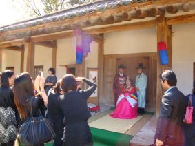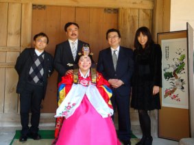 日本から来た演劇関係の友人たちが次から次へと写真を撮る/スヒの左の臙脂色の韓服を着ているのが旦那さん