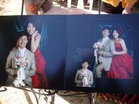 会場の入口のところにおいてある、結婚記念のアルバム/これが韓国の結婚ならではの二人だけのアルバムで、日本人だとちょっと恥ずかしいぐらいに派手! 妻は「うらやましい」といっていたが……