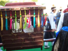 そして、花嫁が駕籠に載せられて運ばれてくるのだが、これが大型女優のスヒだから、大変そうで、見ている参加者の中からも、遠慮なく笑いと拍手が起きた!