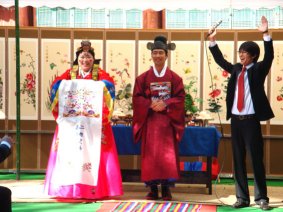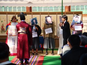 堅い式かと思っていたら、友人たちの歌や楽器の演奏、スピーチなどもあり、最後には、コルモッキル(スヒの所属しているパク・クニョンの劇団)のメンバーが、スヒがこれまでに演じたいろいろな役のお面を被り、花婿がどのスヒを選ぶかという余興が行なわれた
