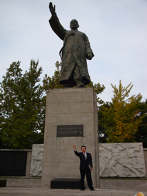 恐れ多くも、韓国の人たちから尊敬されている金九先生の像の前で、同じポーズを! 中国だったら捕まってるな/南山公園の白凡広場にて