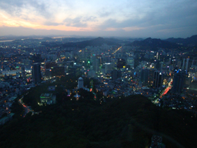 ソウルタワーの上から観た夕暮れのソウルの街/上はソウル駅方面で、下は明洞から鍾路方面。左の方の白く光っているのが明洞ミリオレ
