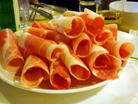 これが、牛肉の薄切りのチャドルベギ! これを網で焼いて岩塩をつけて食べるのだが、もう、絶品の美味しさで、見てるだけで食べたくなる!
