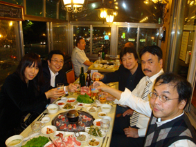 韓国で日本の漫画の翻訳出版などもしている李さん(右から3番目)や中村さん(その隣り)、青木さん(右端)らとおしゃれなチャドルベギの専門店で乾杯!