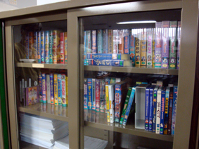 この会社で吹き替えをした外国のアニメ作品(ディズニーが多かった)が棚にズラッと並んでいる/もちろん、正規のもの