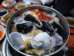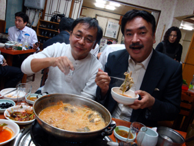 10年前から行っている、韓国で一番お気に入りのフグの店「チョルチョルポッチッ」の、フグ鍋/これでもかというぐらい、フグが入っている! 焼きフグも旨い!